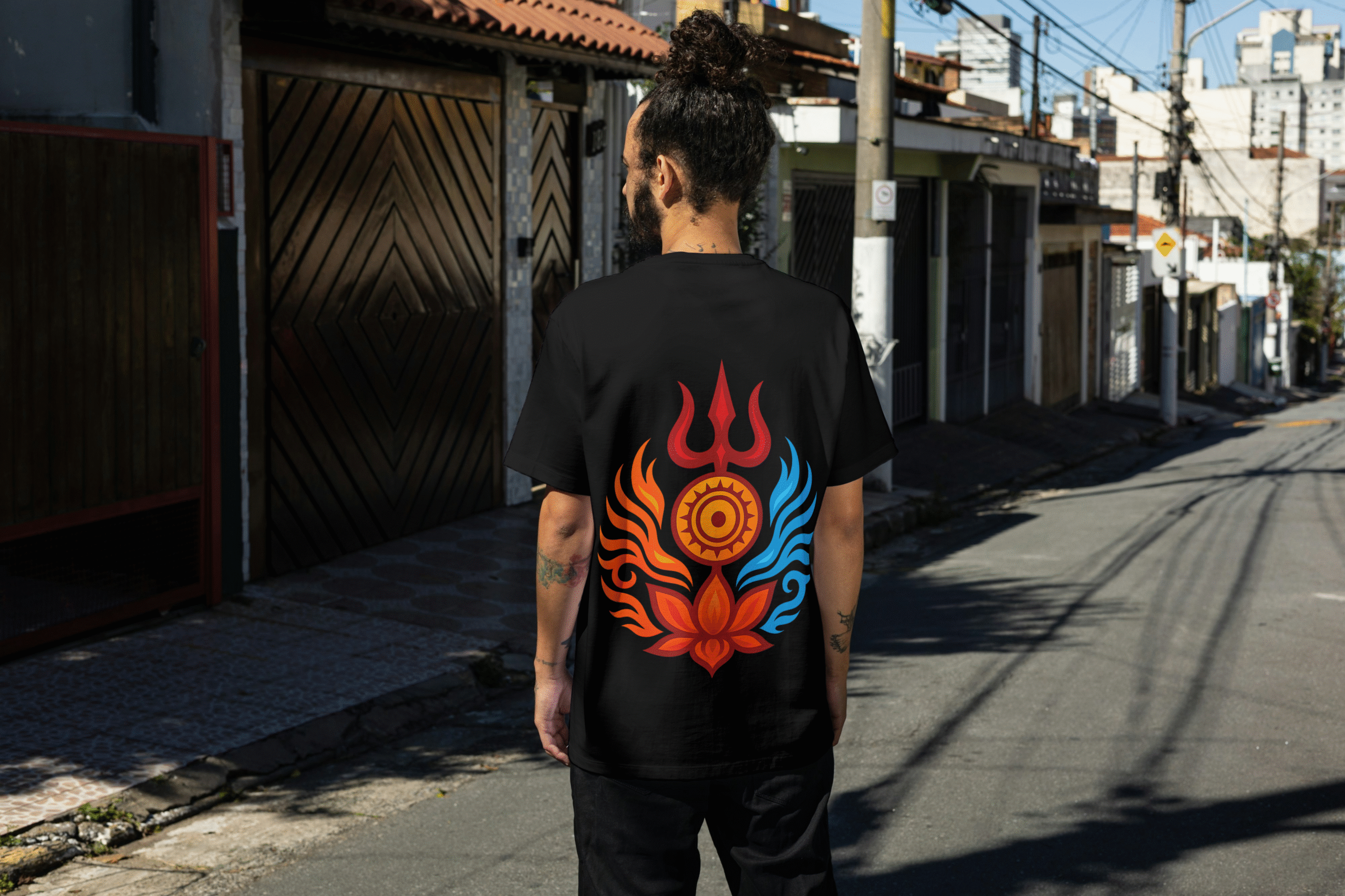 Unleash your inner power with this bold and spiritual oversized T-shirt, featuring a stunning back print inspired by the Trishul, Lotus, and Surya Chakra β symbols of strength, purity, and energy balance.