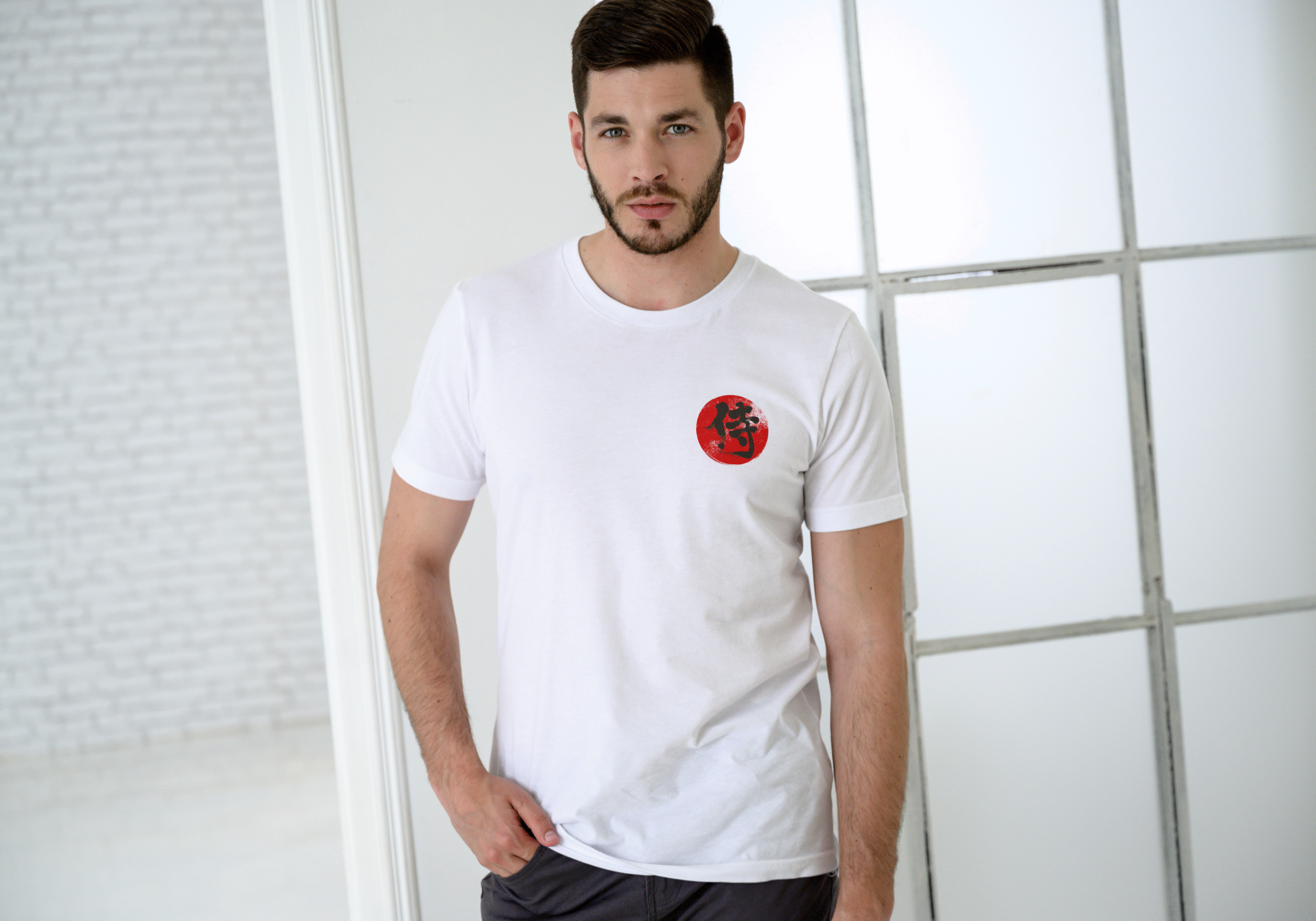 A red circular insignia featuring the Japanese kanji for “Samurai” adds an elegant yet striking detail. Simple, bold, and meaningful — it captures the essence of honor and inner strength.