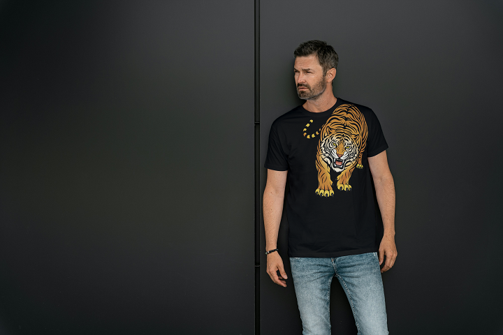 The T-shirt features a striking full-body tiger graphic that stretches across the chest, creating an instant visual statement. The tiger’s forward stance and piercing gaze represent courage, precision, and the relentless pursuit of victory.