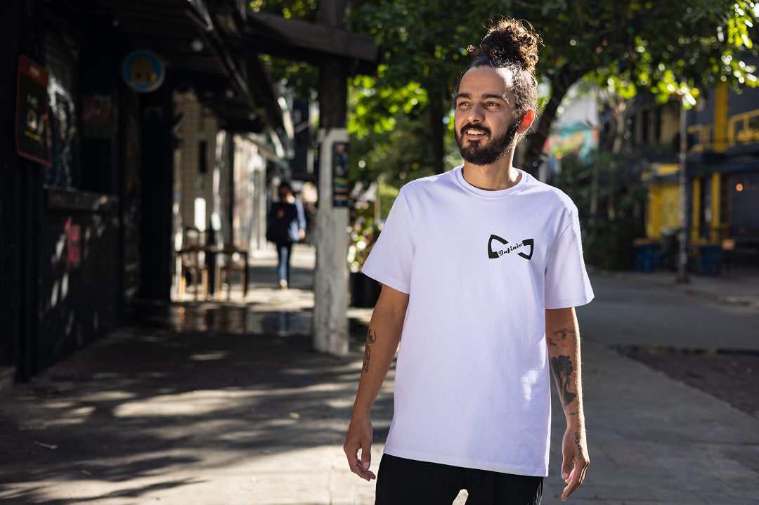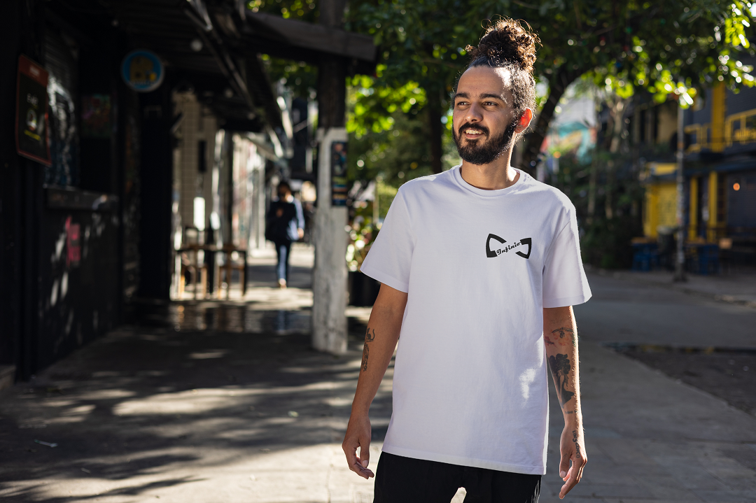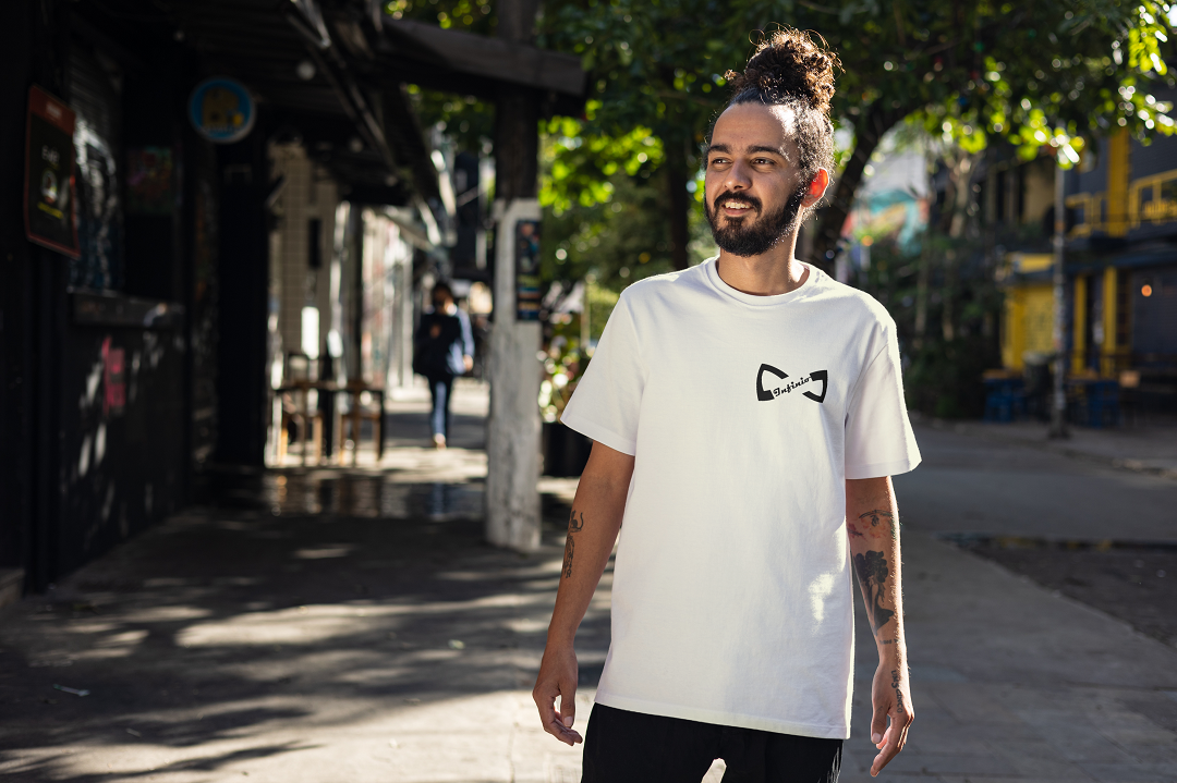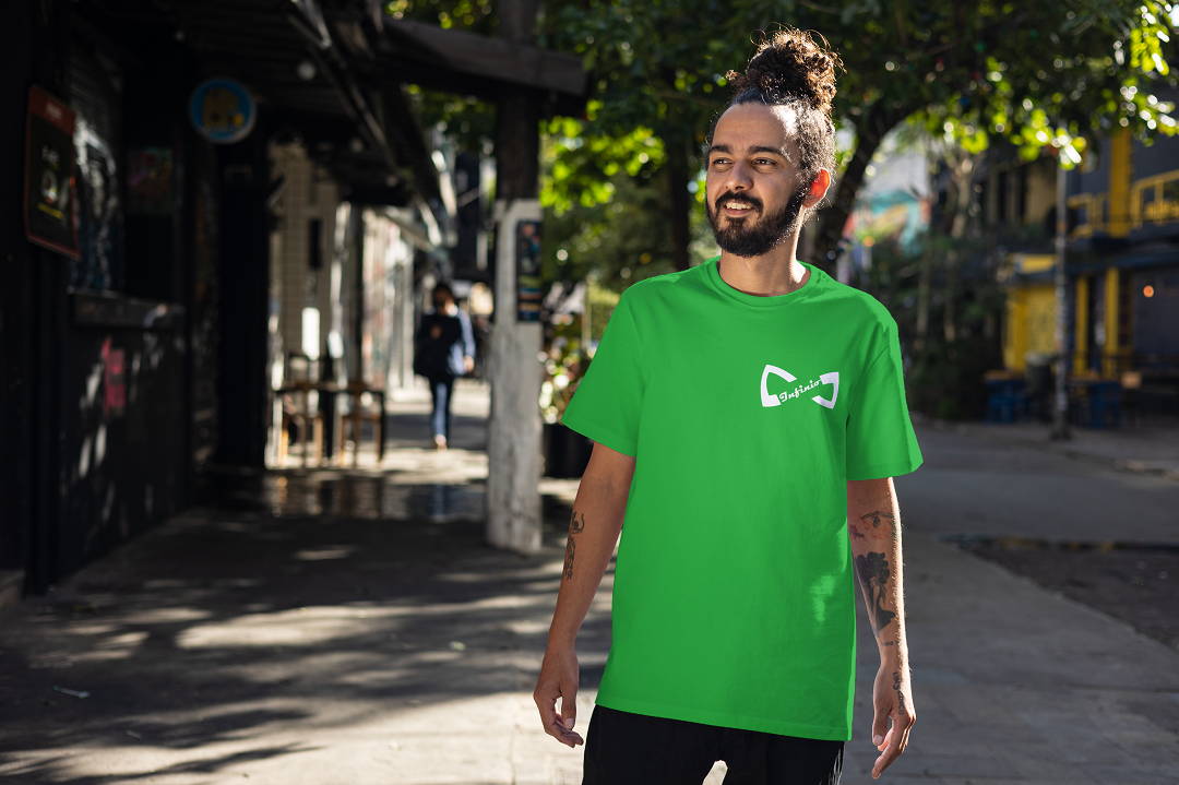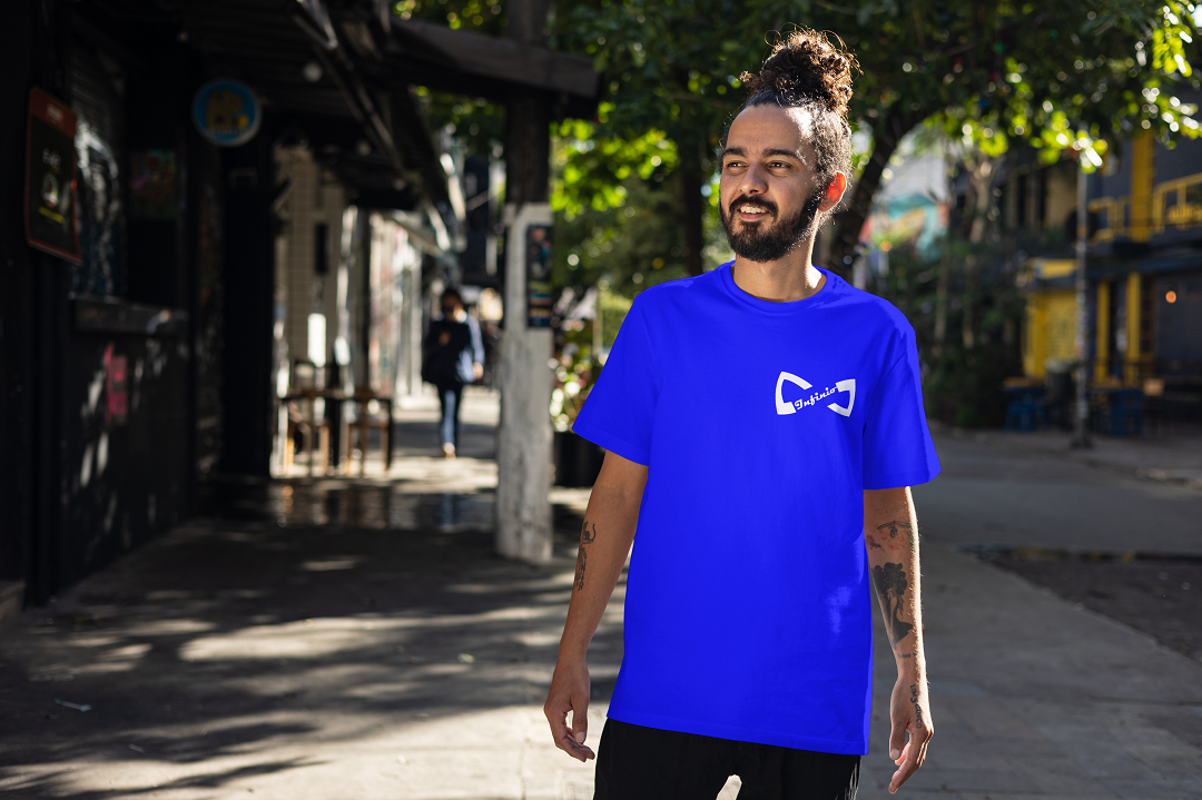 The front features the signature Infinio logo, seamlessly blending the infinity motif with sleek, geometric lettering. Positioned over the heart, it reflects the brand’s message — infinite growth, infinite vision.